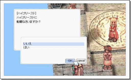 ハイプリーストなら、チョットした裏技でチェイサーに転職が可能なんだヨネ 」 「 ホントに? 」 「 とりあえず、パパパッとハイプリーストになってきなヨー 」 それを聞いて、姉妹がスゴイ勢いで駆け出しました。